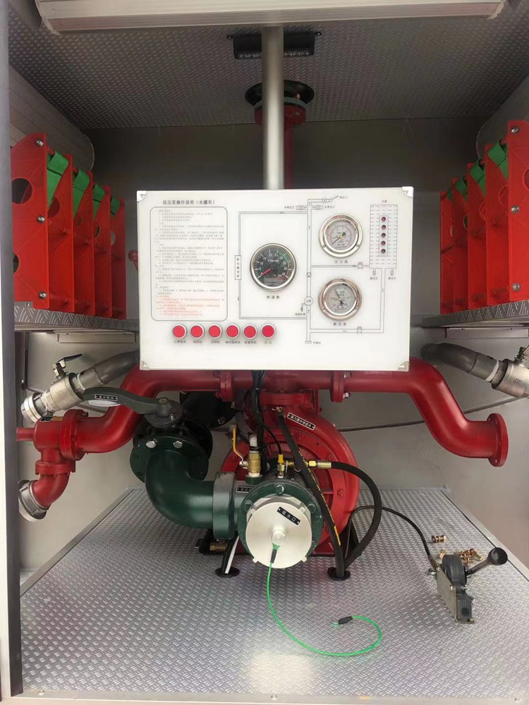 泵房位于整車后部,兩邊與后邊設(shè)鋁合金卷簾門,內(nèi)有照明燈,泵室兩側(cè)可放置部分常用器材 |